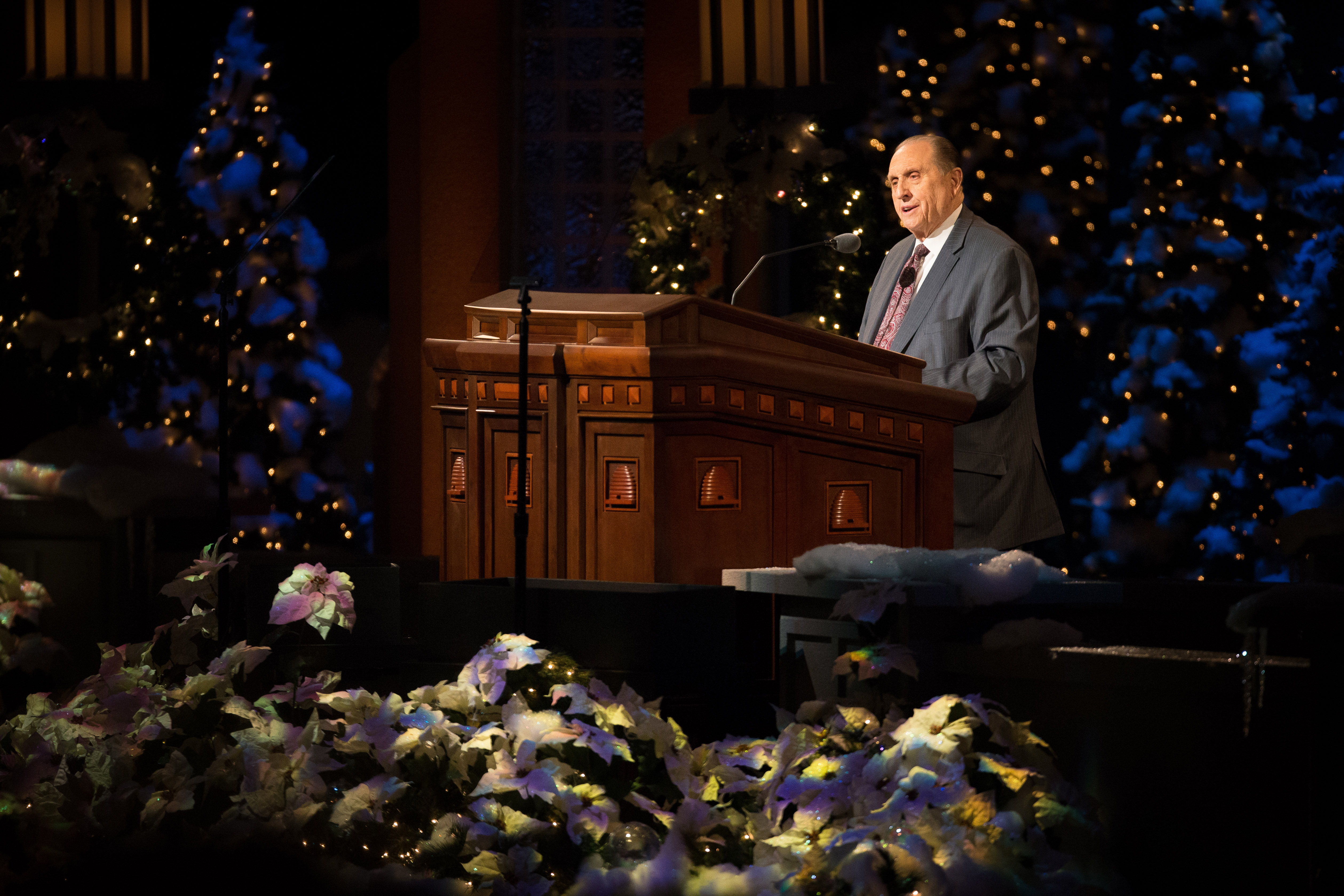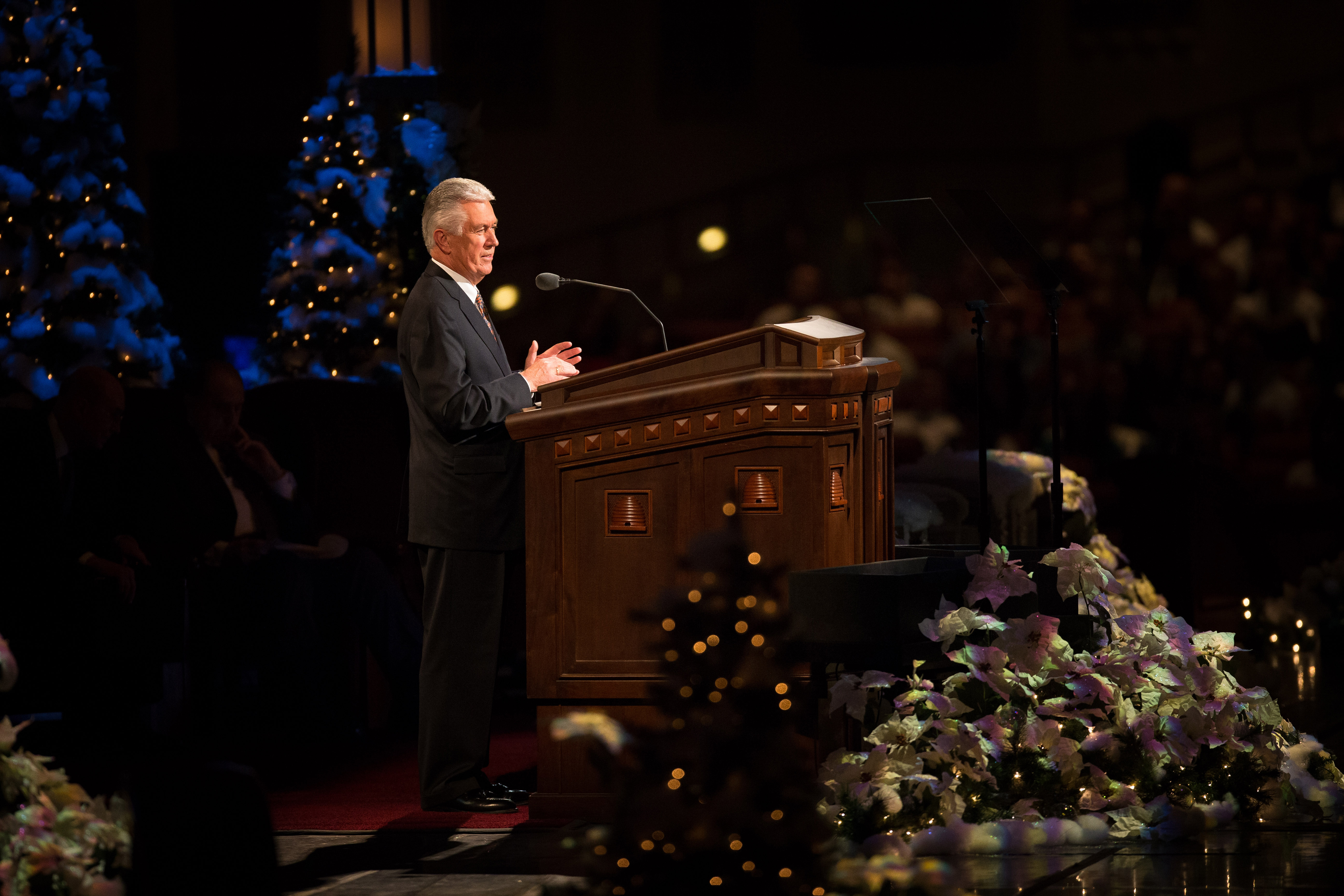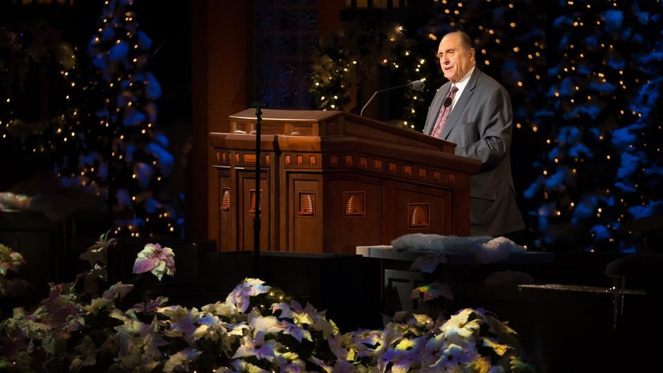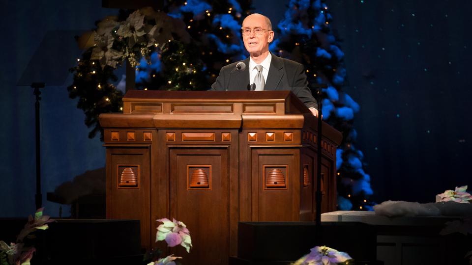 «Истинная радость Рождества прибывает, когда мы сосредотачиваемся на Иисусе Христе», – сказал Томас С. Монсон, президент Церкви Иисуса Христа Святых последних дней, в своем выступлении во время ежегодного Рождественского Божественного часа Первого Президентства, прошедшего в Конференц-центре в Солт-Лейк-Сити, штат Юта, 2 декабря 2012. В ходе этого Божественного часа прозвучали Рождественские послания Первого Президентства и музыка в исполнении Мормонского Табернакального хора и Оркестра на Храмовой площади.